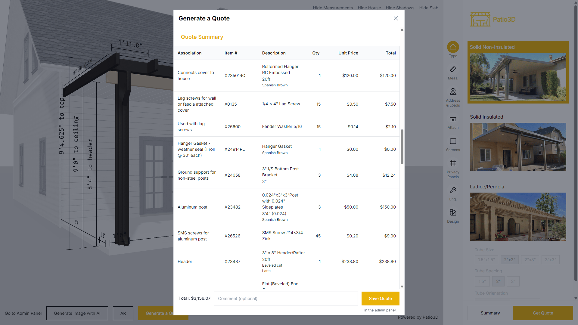 “If they design it, they'll want to know the price.” Did you know? Patio3D has full engineering integration for Alumawood and Four Seasons, based on the ESR-1398 (2021 IBC), ESR-1953 (2021 IBC), and ESR-2229 plans, all approved for use nationwide! Try it here Accurate engineering means customers can explore unlimited styles and sizes with perfectly accurate 3D renders — instantly! Patio3D is aware of every structural detail in the ICC-ESR reports. Such as: For on-slab installations, the...